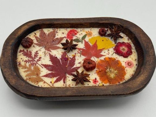 Dried Floral Botanical Candle in a Wooden Bowl- Fall