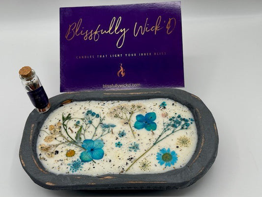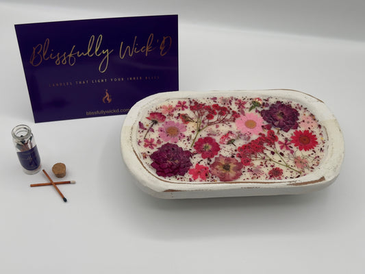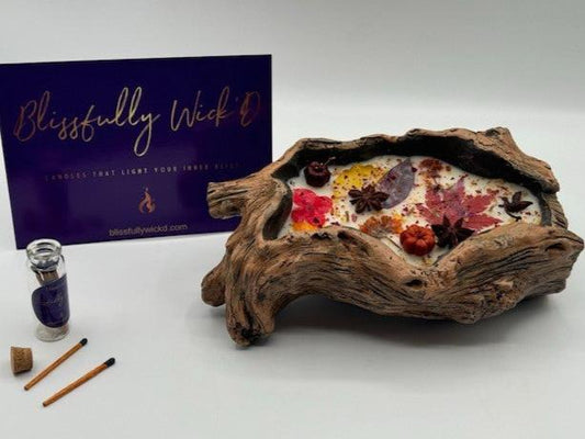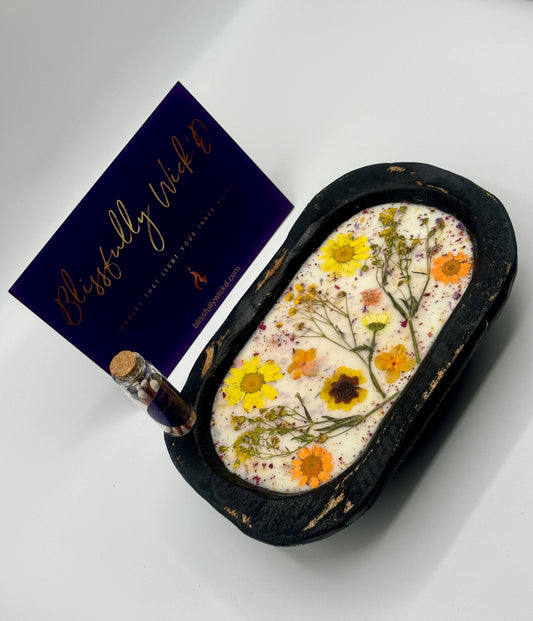 Dried Floral Botanical Candle in a Log Bowl