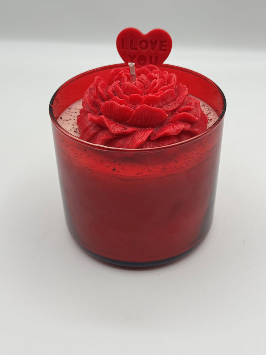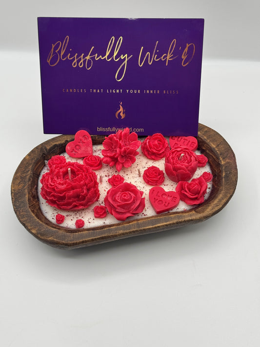 Red Heart Flowerbed Soy Candle in a Wooden Bowl