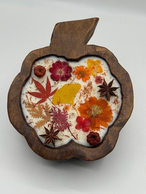 Dried Floral Botanical Candle in a Wooden Pumpkin- Fall